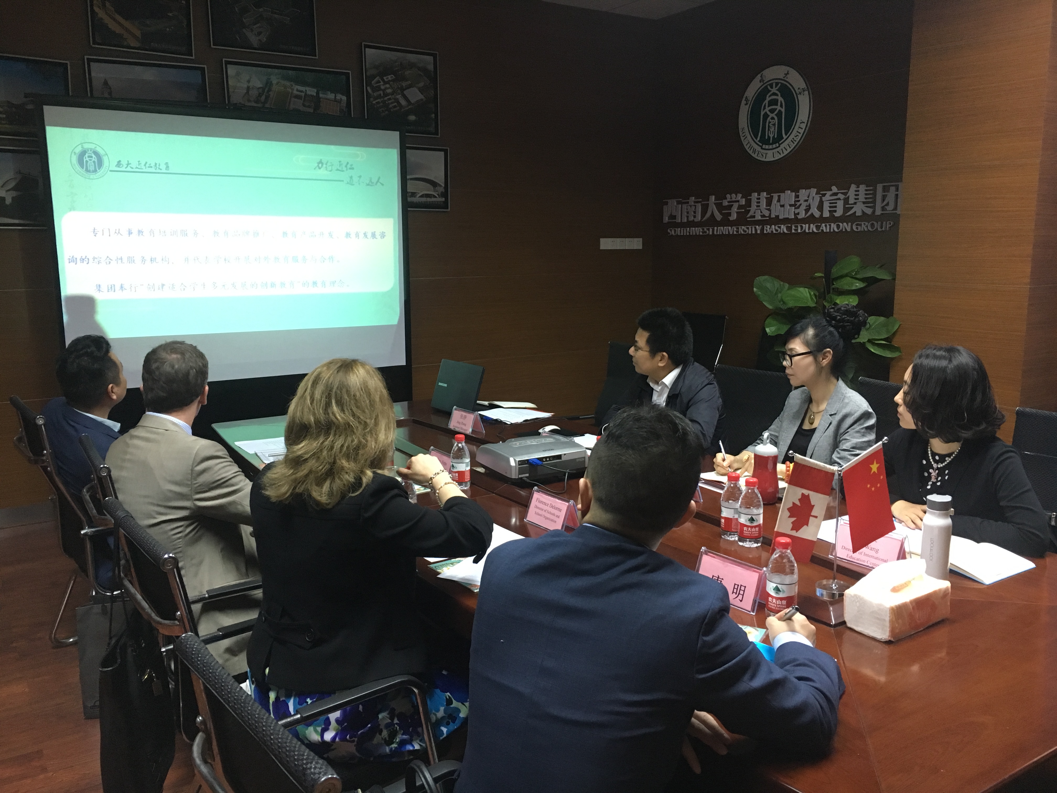 4月3日上午,加方代表先是在西南大学基础教育集团国际教育中心汪霞主任的陪同下参观了西南大学校史馆,了解我校110余年的办学历史和深厚底蕴。随后,一行人到达西南大学基础教育集团,参加了“双方建立友好合作关系”的会议,集团游伟副总经理、陈红副总经理等领导层出席了该会议。